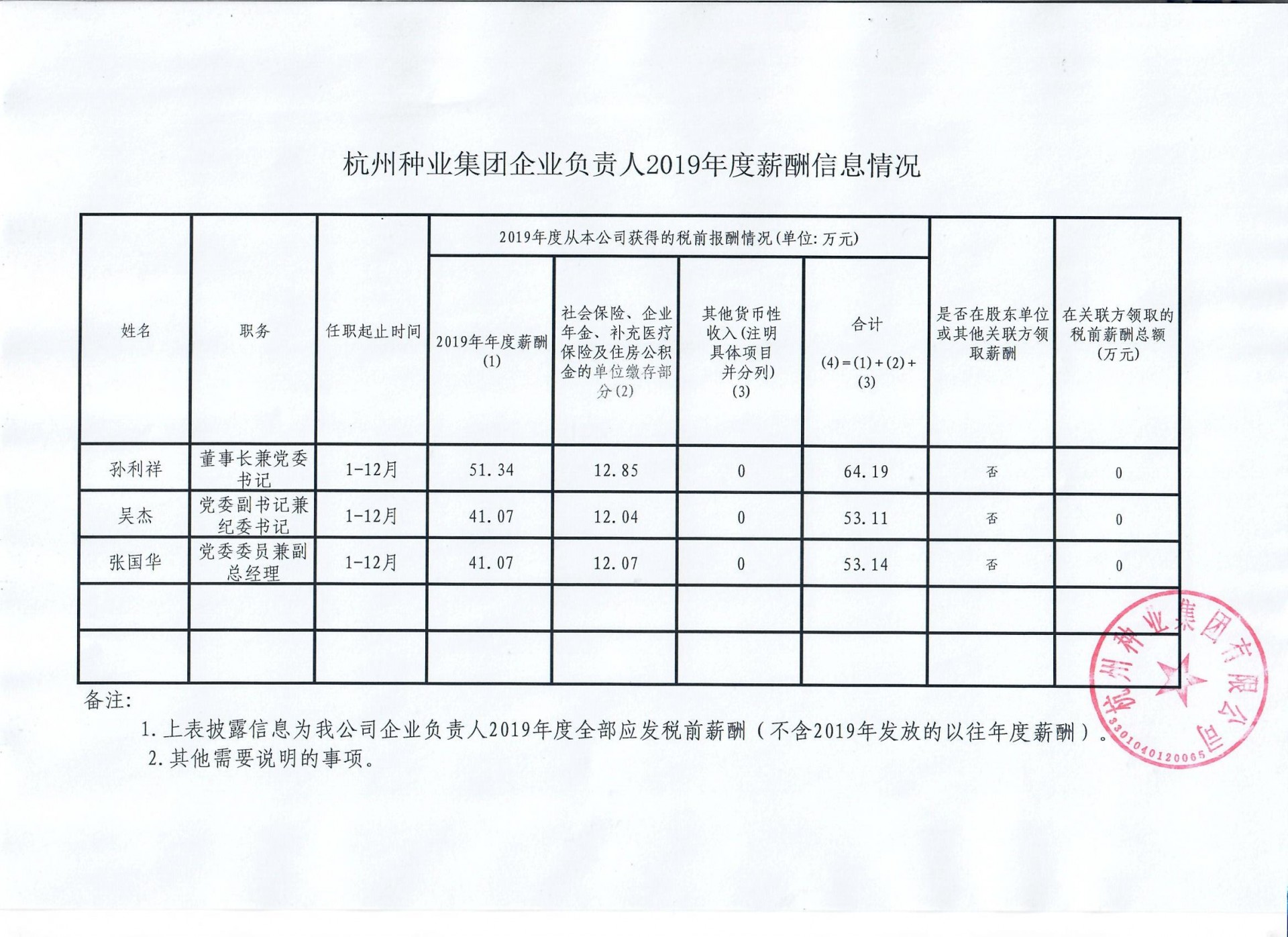 杭州种业集团企业负责人2019年度薪酬信息情况