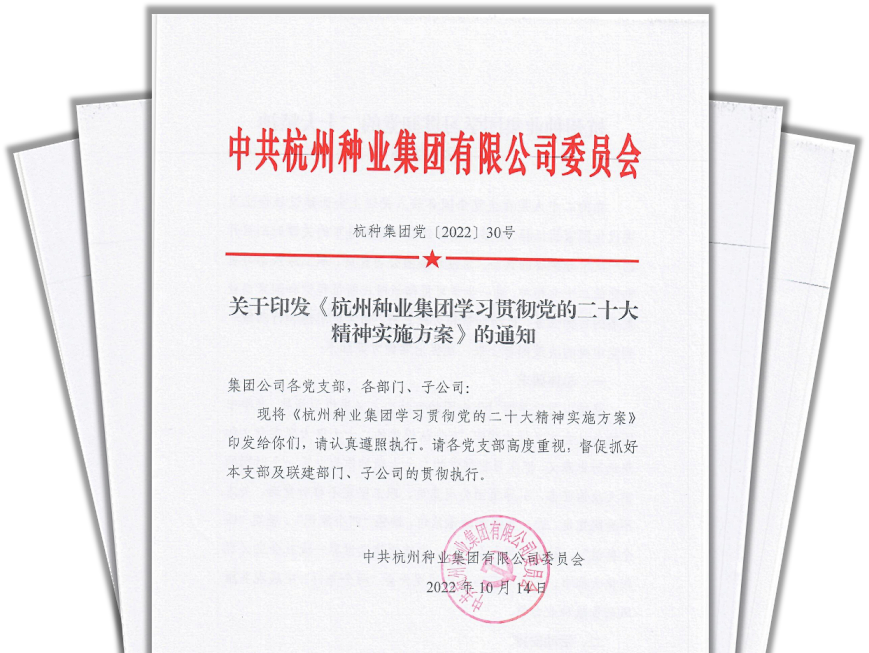 近日,集团党委下发《杭州种业集团学习贯彻党的二十大精神实施方案》。基层党支部切实负责,在把握总目标、总方向、总要求的前提下,对各项目标和任务进行细化,不断落实“深化‘种·丰收’服务,以宣讲促共富”等10条行动举措,推动党的二十大精神进集团、进田间地头、进生产一线,迅速掀起了学习宣传贯彻党的二十大精神热潮。